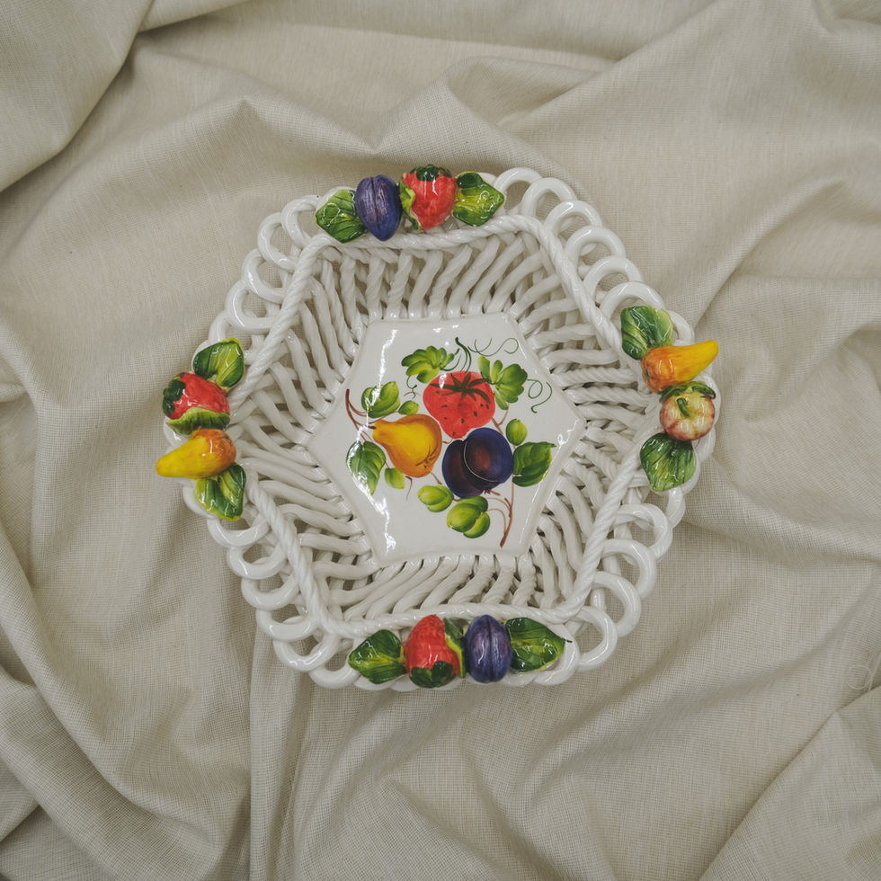 Krāsa: Sešstūra formas pīts augļu trauks ar smalku roku pinumu un rokām veidotiem, krāsotiem augļu dekoriem. Balta keramikas pamatne kontrastē ar koši dzeltenām, sarkanām, violetām un zaļām krāsām, kas piešķir traukam dzīvīgumu un Vidusjūras noskaņu. Katrs gabals ir unikāls, gatavots Itālijā, izmantojot tradicionālo roku darbu un glazūras tehniku.